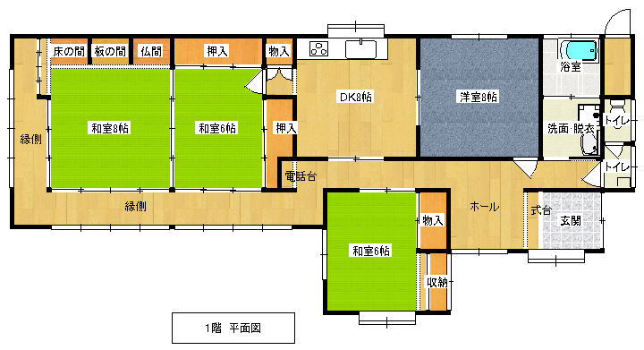 物件種別 売買物件(物件番号:130063) 所在地 五十猛町 住宅面積 139.44㎡ (42坪) 敷地面積 314.00㎡ (94坪) 物件構造 木造 瓦葺き 平屋建 交渉状況 募集中 建物売却希望金額 630万円 土地売却希望価格 建物売却金額に含む 駐車料金 無し 敷金礼金 無し 建築年 昭和61年 駐車場 有り 1台 水道 上水道 トイレ 屋内 水洗(合併処理浄化槽) 洋式 風呂 灯油ボイラー 附属建物 【倉庫】無し 【納屋】無し 【蔵】無し 【車庫】有り1台 その他の施設 無し 農地(田) 無し 農地(畑) 無し 小学校区 大田市立静間小学校 中学校区 大田市立第二中学校 修繕の必要性 修繕の必要有り 市役所から所要時間 大田市役所より車で15分 最寄りのバス停及び所要時間 大浦東口バス停より徒歩3分 特記事項 大田市のほぼ中央の海岸部に位置し、国道9号線脇の便利な場所にあります。 しっかりとした建物で、内部も高価な木材が使用してあります。和風の塀も見事です。夜には部屋から見える漁火が素晴らしく、安心感を与えてくれる物件です。 物件位置 西部ブロック 西部ブロックは、日本海に面した鳥井町、静間町、五十猛と中心地に位置する長久町の4町からなる地域です。海岸部の漁村と内陸部の農村に大別されますが、歳徳神や五十猛町大浦に伝承される小正月行事の「グロ」等仮屋をはじめ、地域の特性を活かしながら、住民による独自の伝統行事や伝統芸能が保存・継承されています。長久町の中心地には大型店舗や医療機関、保育園などの施設があり若年層の定住もあり、平成29年には青年団も結成されました。 おおだ全域で住まいを探すエリアから住まいを探す 大田市内の空き家情報をご覧いただけます。 掲載している物件をご覧になりたい場合は、事前に大田市役所都市計画課TEL:0854-82-1600(代表)までご連絡ください。おおだの空き家バンク利用制度空き家バンク制度の手順をご案内します。アパート・マンション等をお探しの方はこちら 大田宅建センター大田市内の不動産を探す場合はこちらの名簿に連絡先等が乗っていますのでご活用ください。空き家やアパート・マンション情報が掲載されているサイトもあります。市営住宅